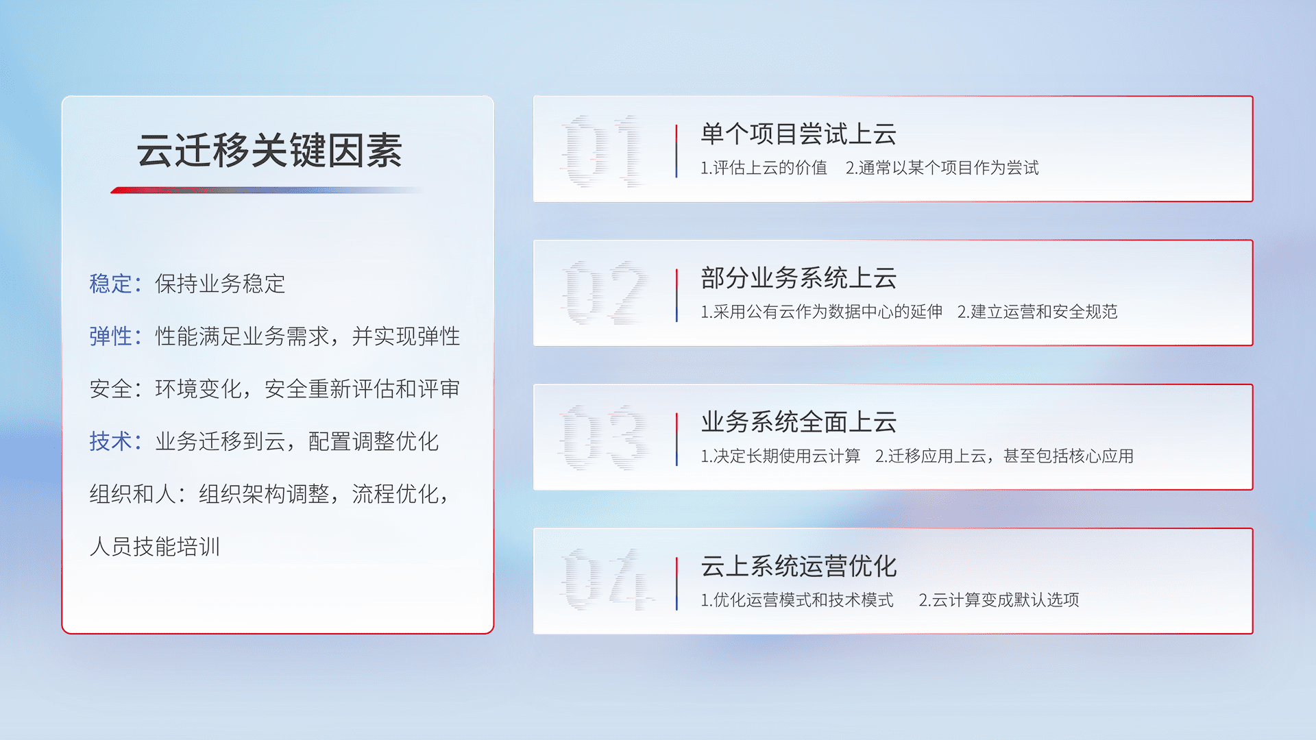 结合实际业务,,,,从规划设计、、云平台选型、、云原生改造、、、、数据迁移、、集成交付,,,,迁移全过程为客户识别最佳上云路径,,做好风险识别管理,,,,设计网络架构、、身份权限、、安全审计合规、、、、操作审计、、、、日志审计、、监控告警策略、、多站点容灾设计等,,,对云上基础设施进行整体规划,,,,提升IT治理水平,,,以满足弹性、、、、高可用、、高性能的需求。。