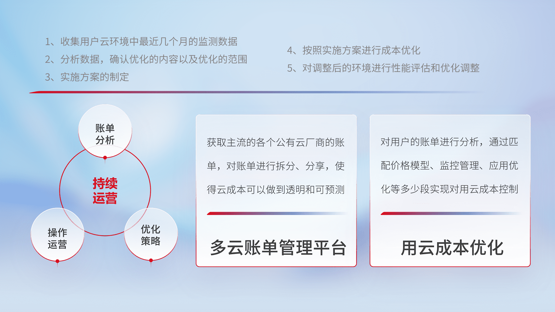 通过多云纳管,,以统一的资源数据模型把客户的云资源进行抽象和封装,,,,进而实现对多云资源的统一操作,,,保障云资源管理的可靠性、、稳定性与可用性。。。量身定制化运维内容,,配置、、、开发运维、、、、补丁管理、、备份、、监控、、、、认证和访问管理、、、审计和日常巡检等,,保障在用云过程中的可靠度,,稳定度以及高可用率。。